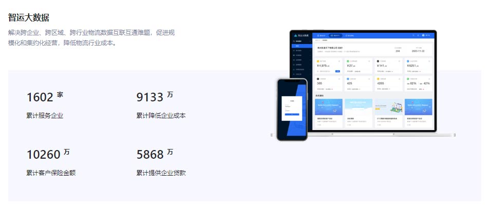 智运大数据平台zy.zone,融合了国内千万辆货车高速行驶数据、轨迹数据、实时北斗+GPS数据、保险数据、路政数据、车辆诚信记录等数据,通过数据校验和算力分析代替人工核查核算,降低企业经营风险,实现了为物流企业减负增效率,解决了物流行业诚信经营、数据核验、经营成本高、业务流转效率低等痛点。同时,利用互联网技术并结合网络货运平台模式,为物流行业解决资金结算、票据合规、供应链金融、应收账款质押等经营融资难题。