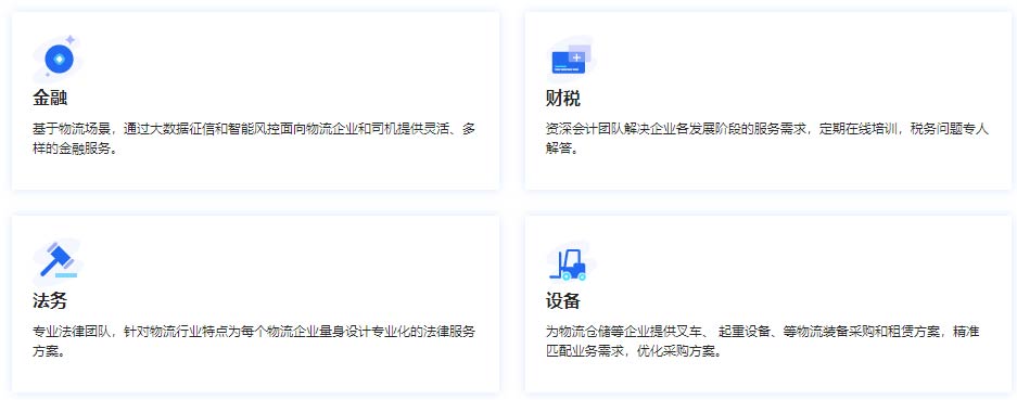 另外,智运大数据平台zy.zone联合各城市当地优秀的财税企业、律所企业、物流设备生产企业等行业配套企业,为物流行业提供专业的财税顾问服务、法律咨询服务、作业设备采购服务等一整套服务、咨询、采购解决方案。