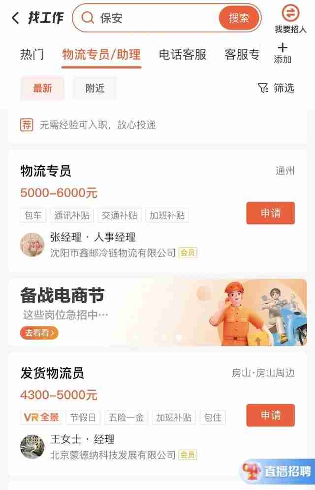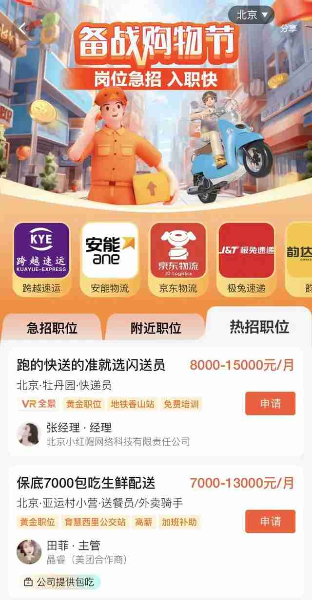 正如58同城数据显示,电商物流岗位向来是“双11”期间的热门岗位,快递公司的“抢人”大战年年上演,急需更高效的招聘方式。为保障企业人才供应,58同城整合岗位供需,上线“备战购物节”招聘专区,汇聚包括京东物流、极兔速递、顺丰速递、圆通速递等全国各地优秀企业,覆盖物流/仓储、司机/交通服务、客服等多个紧缺岗位,为众多电商物流企业解决燃眉之急。