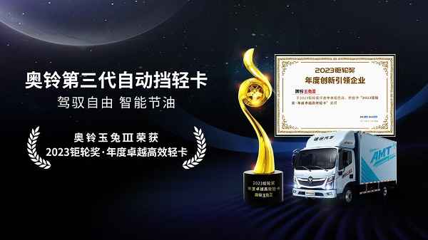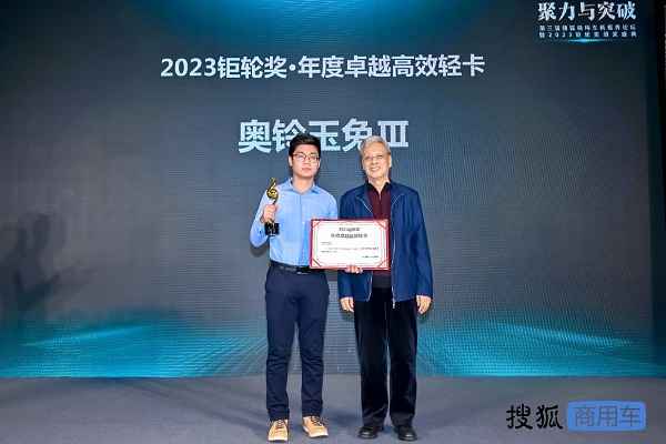 12月14日,由搜狐汽车、搜狐商用车主办,中国国际贸易促进委员会汽车行业分会指导的第三届搜狐商用车新视界论坛暨2023钜轮奖颁奖盛典在北京举行。作为第三代自动挡轻卡,奥铃玉兔Ⅲ被授予“2023钜轮奖·年度卓越高效轻卡”荣誉。